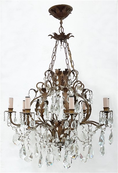 Lampadario a otto luci in metallo e lamierino dorato con pendenti in vetro sfaccettato (h cm 100 ca) (difetti e mancanze)