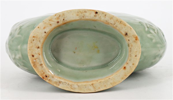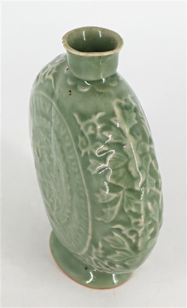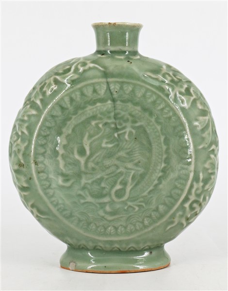 Moonflask in porcellana celadon decorata con motivi floreali e fenice Cina, sec