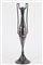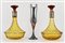 Lotto composto da coppia di bottiglie in vetro ambrato e molato con tappo e collo in argento unito a un vasetto soliflore biansato in argento inglese. Base appesantita (h max cm 26,5) (difetti)