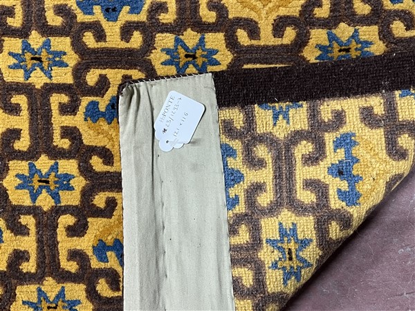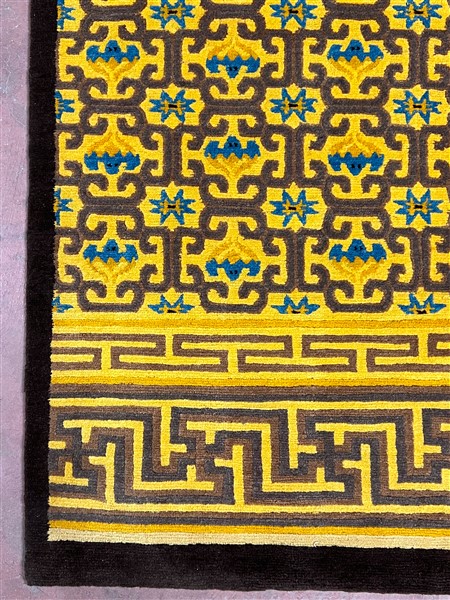 Tappeto Nepal, manifattura recente. Decoro con motivo tronco di cornice e campo ornati da motivi tipici della provenienza (cm 121x116) (difetti)