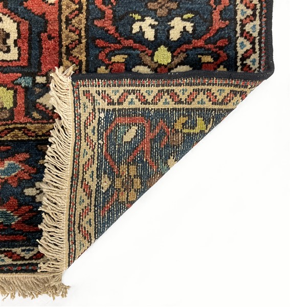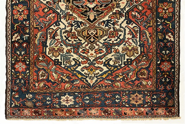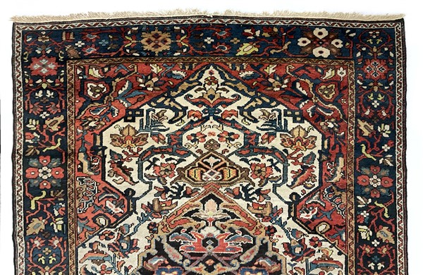 Tappeto Bachtiari, Persia, fine secolo XIX. Decoro con grande medaglione con puntali a fondo marrone scuro su campo bianco cosparso di rami fioriti, bordura a testuggine su fondo blu (cm 291x177) (difetti)