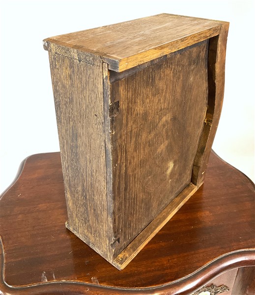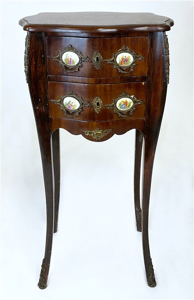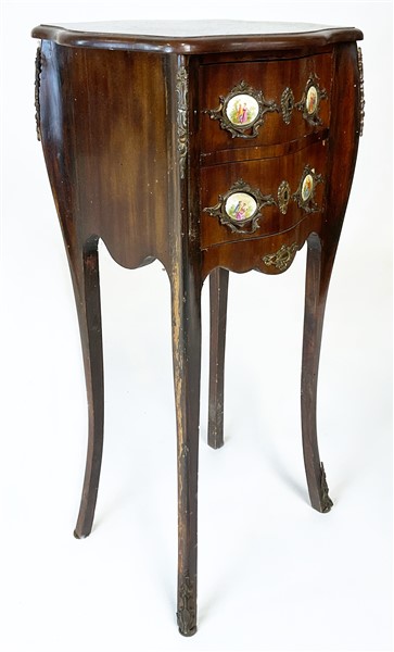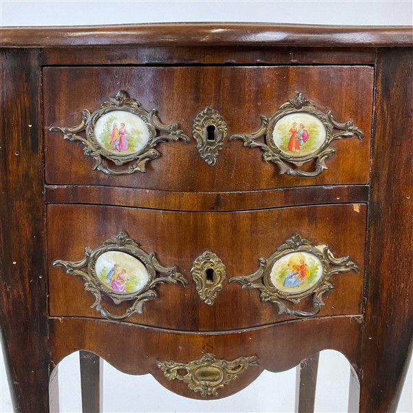 Mobiletto da centro con fronte a due cassetti e maniglie decorate da placche in porcellana, alte gambe mosse (cm 40x74x32) (difetti)
