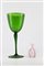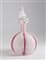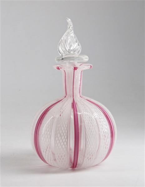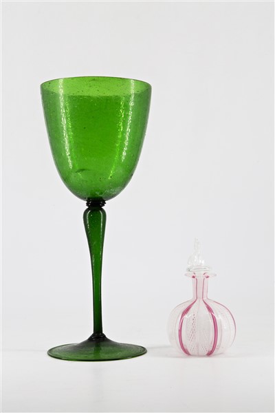 Lotto composto da un calice in vetro soffiato acidato trasparente verde e una bottiglietta in vetro soffiato trasparente a canne a reticiello lattimo e vetro incolore e rosa opaco. (h max cm 30)