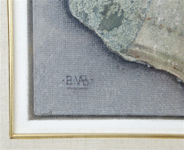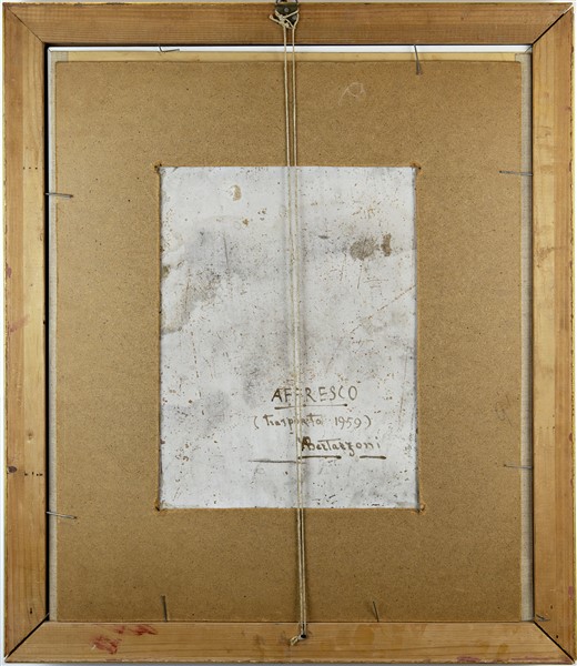 "Affresco", dipinto a tempera sagomato montato su compensato (cm totali cm 40 x 30) siglato in basso a sinistra; firmato e iscritto al retro