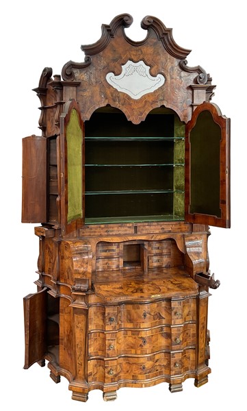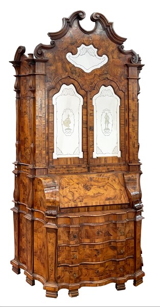 Trumeau in stile settecentesco veneto lastronato in noce e radica di noce con fronte e fianchi mossi a tre cassetti e ante laterali, calatoia celante antina e quattro tiretti, parte superiore a due ante con specchi incisi e cimasa intagliata a volute contrapposte, ante laterali. (cm 148x271x68) (difetti)
