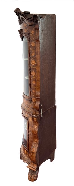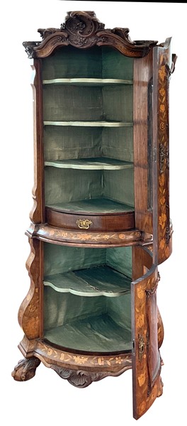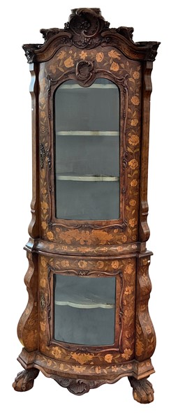 Angoliera a due corpi lastronata ed intarsiata in legni vari a motivo floreale, parte inferiore ad un'anta con vetro e piedi ad artiglio su sfera, parte superiore ad un'anta con vetro e cimasa intagliata a volute fiorite. Olanda, secolo XIX. (cm 60x219) (difetti)
