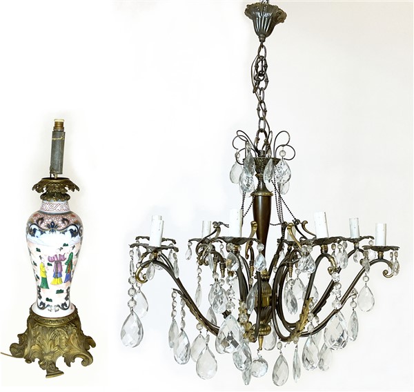 Lotto composto da lampadario in metallo a otto bracci con pendenti in cristallo sfaccettato (d cm 64) ed una lampada da tavolo in bronzo e porcellana dipinta in policromia con figure all'orientale (h cm 53) (gravi difetti e mancanze)