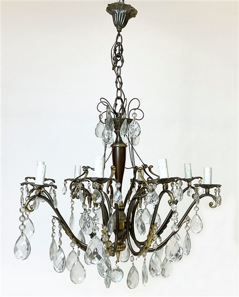 Lotto composto da lampadario in metallo a otto bracci con pendenti in cristallo