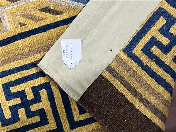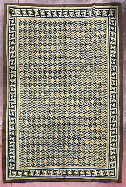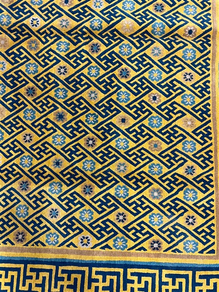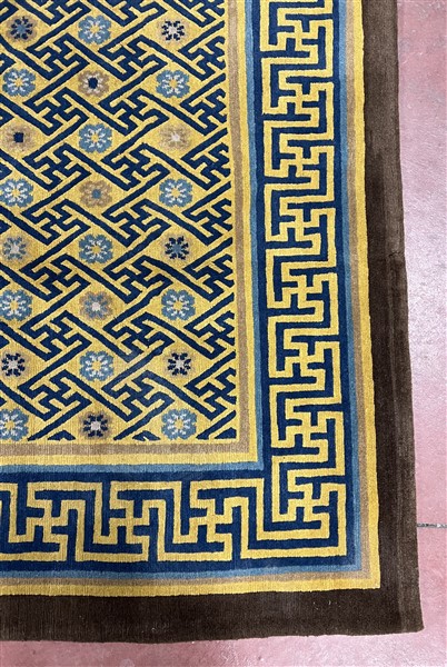 Tappeto Nepal, recente manifattura. Decoro all over con griglia blu su fondo giallo cosparso di fiori (cm 339x225) (difetti)