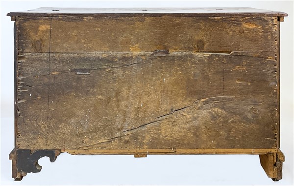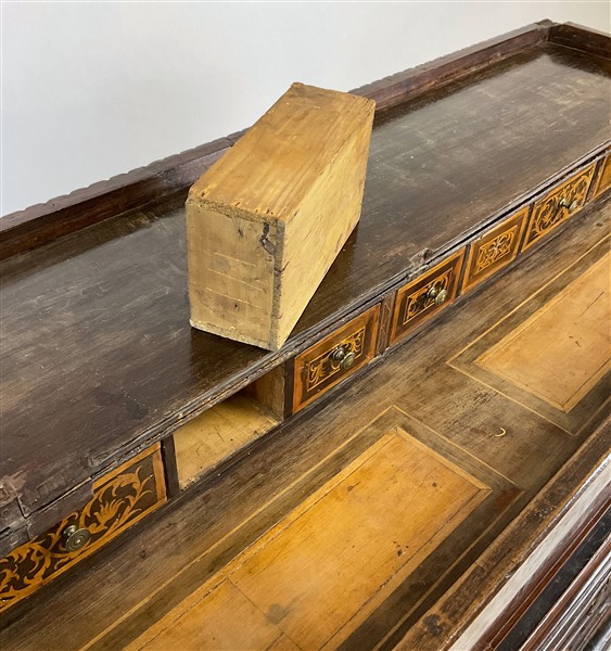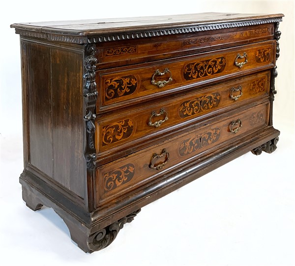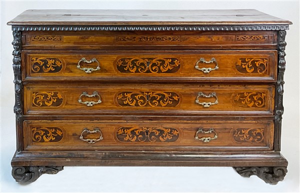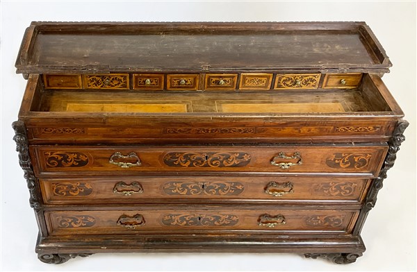 Canterano in noce intarsiato in legni vari a volute con fronte a tre cassetti e piano in parte ribaltabile che rivela otto tiretti. Montanti intagliati a figura e volute, bordi dentellati e piedi intagliati a mensola. Veneto, secolo XVII (cm 149x89x60) (difetti e restauri)