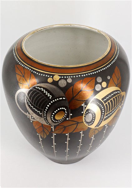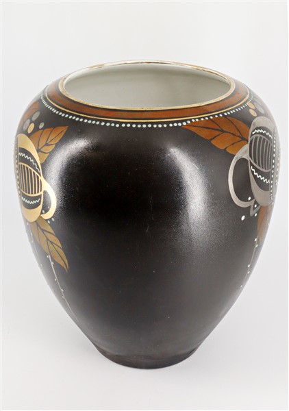 Vaso Art dèco in ceramica decorata a fiori stilizzati. Francia, 1925ca. Marca sul fondo. (h cm 32) (gravi difetti e restauri)