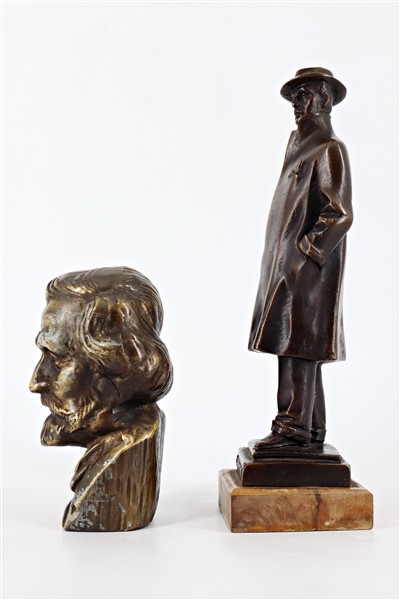Lotto composto da due sculture in bronzo e metallo raffiguranti "Giacomo Puccini" e "Giuseppe Verdi" (h. cm max 20) (gravi difetti)