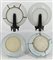 Quattro piatti in porcellana bianca e blu decorati con motivi floreali e simboli