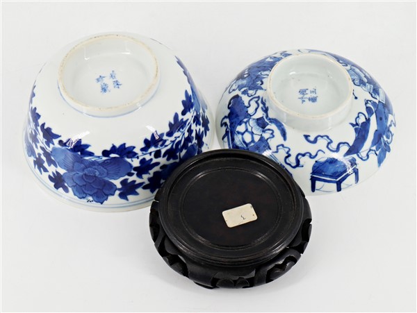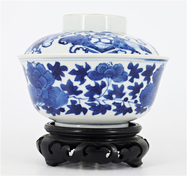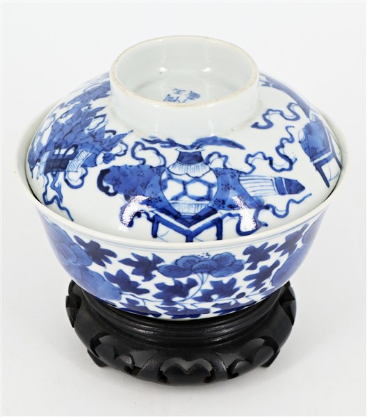Ciotola in porcellana bianca e blu decorata con motivi floreali con base in legno, insieme a un coperchio non pertinente in porcellana bianca e blu decorato con oggetti preziosi