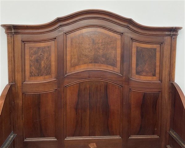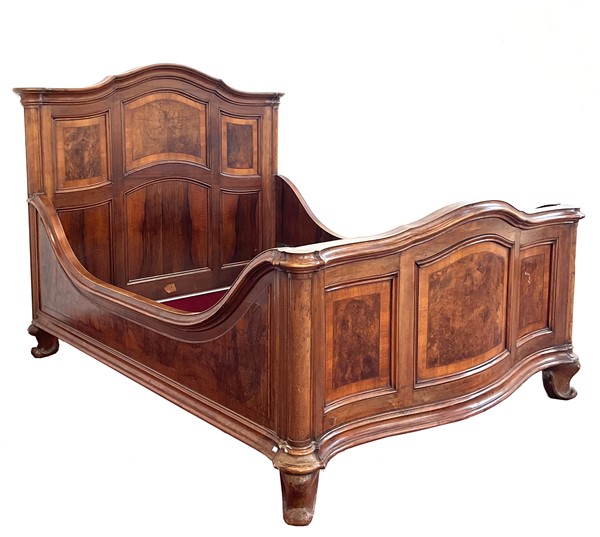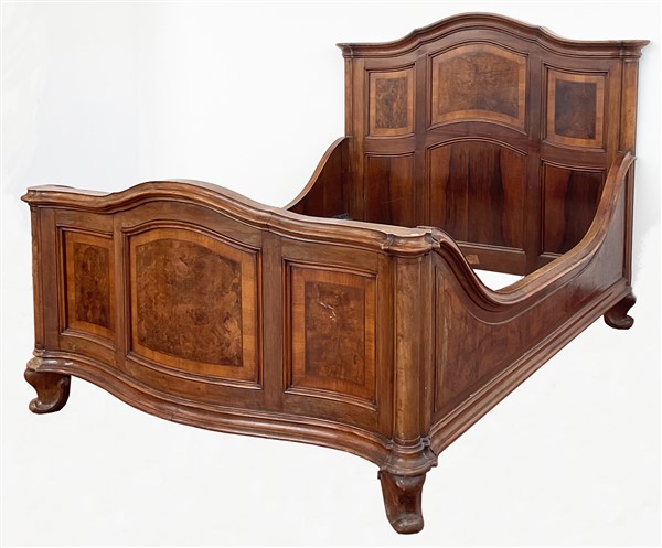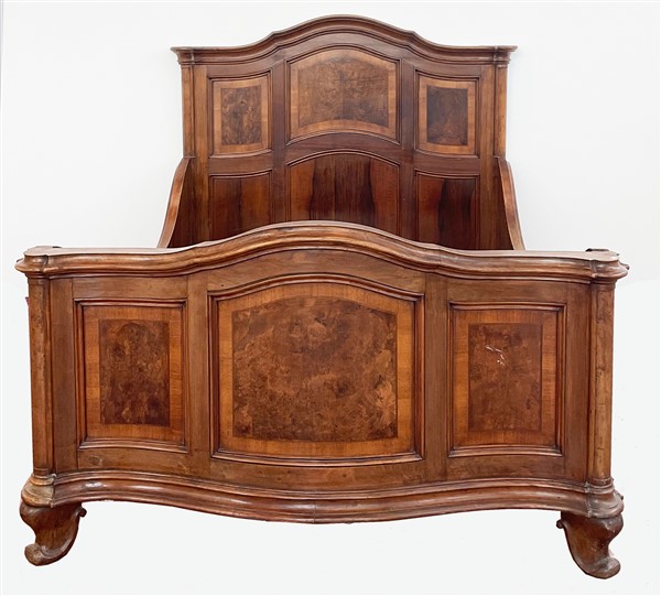 Letto con testiera e pediera di forma mossa in noce intagliato, pannellato e filettato con specchiature in radica di noce, piedi a ricciolo (cm 170x156x224) (difetti e restauri)