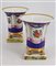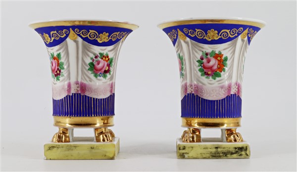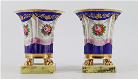 Manifattura del secolo XIX. Coppia di vasetti in porcellana con piedi ferini su