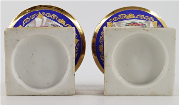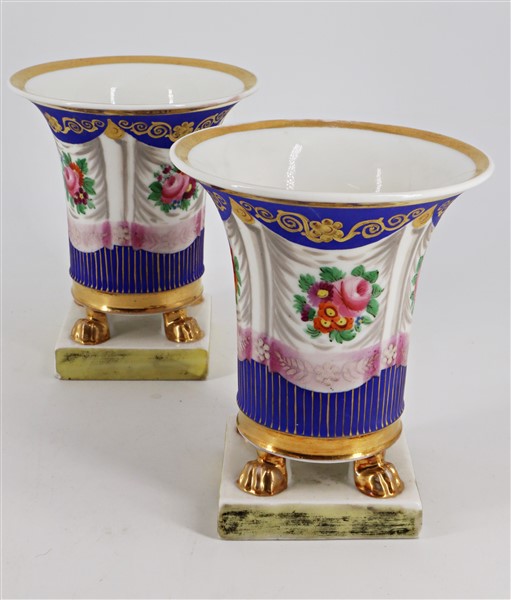 Manifattura del secolo XIX. Coppia di vasetti in porcellana con piedi ferini su base quadrata, decori in policromia a fiori su fondo blu con profili in oro (h max cm 13,5) (lievi difetti)
