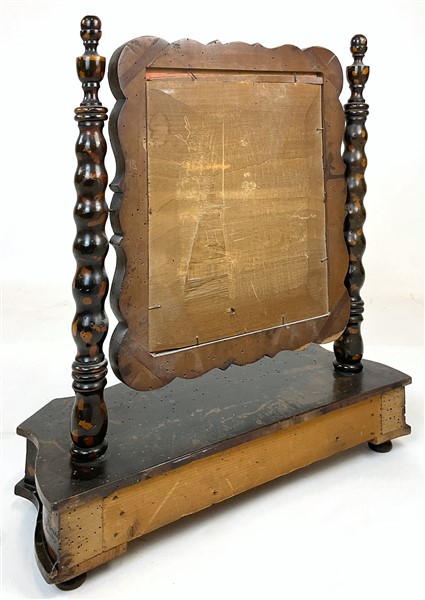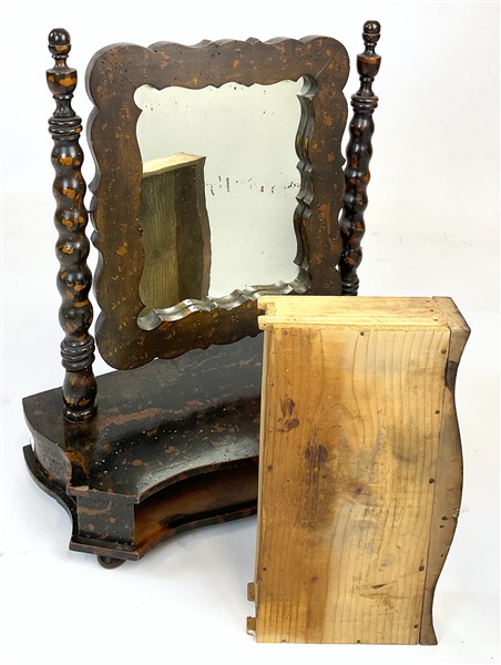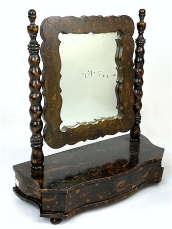 Specchierina d'appoggio di forma sagomata in legno laccato con sostegni torniti e cassettino alla base (cm 51x58x23) (difetti)