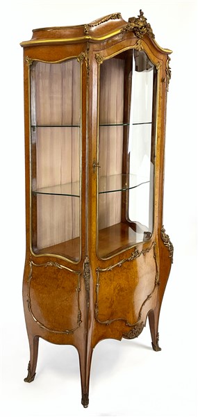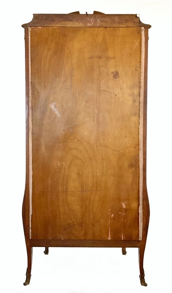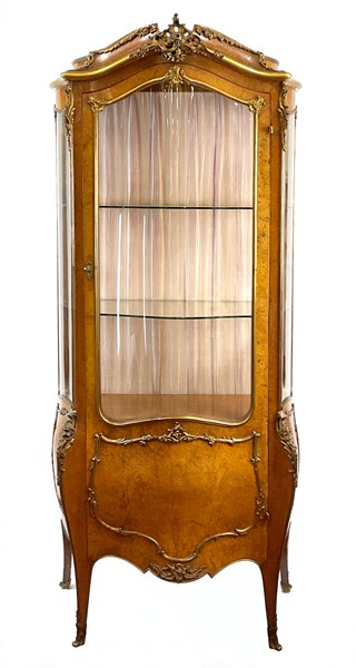 Vetrina di forma mossa impiallacciata in radica ad un'anta sul fronte con guarnizioni in metallo dorato a volute e motivi floreali (cm 78x176x38) (lievi difetti)