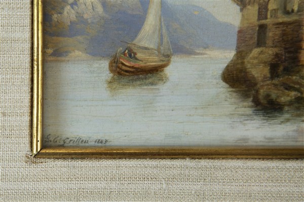 S. G. Grillen "Isola fortificata con barche a vela" 1843 olio su tavola (cm 14