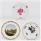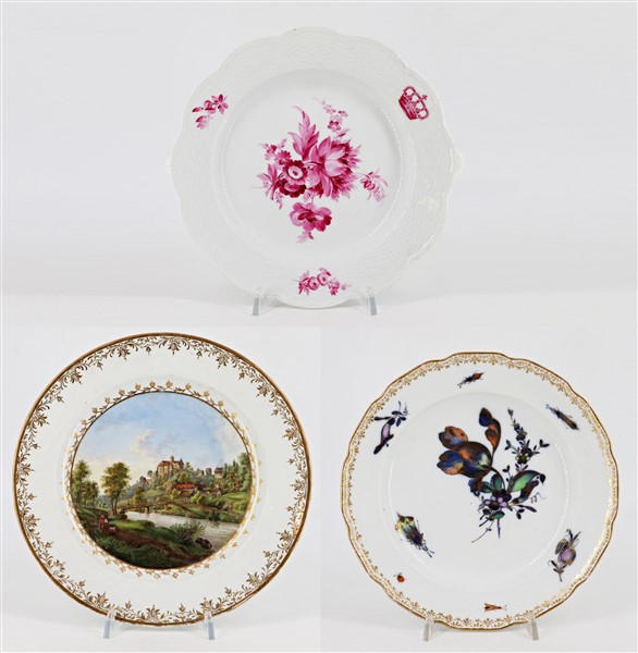 Manfattura di Meissen, secolo XIX. Lotto composto da tre diversi piatti in porcellana di cui uno decorato a paesaggio, uno a fiori in porpora con corona nella tesa e uno a fiori e insetti, due con profili in oro (d max 23,5) (lievi difetti)