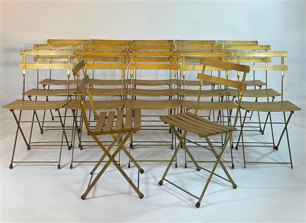 Gruppo di diciassette sedie pieghevoli da esterno verniciate in metallo dorato. Italia, secolo XX. (cm 41x81x35) (difetti e restauri)