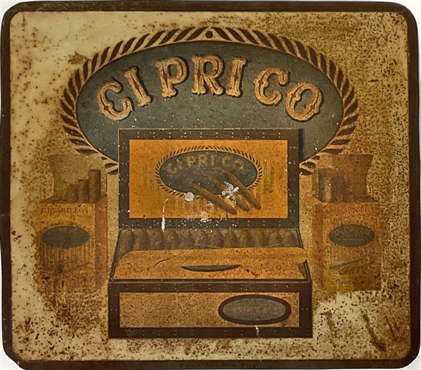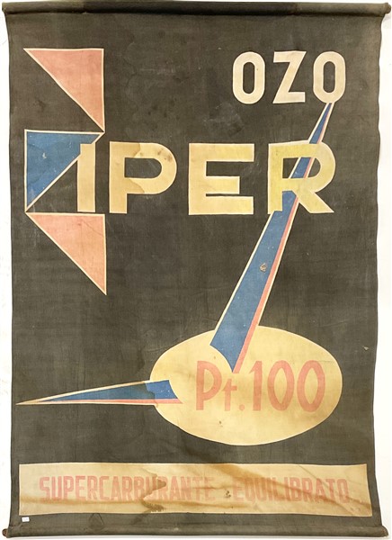 Lotto composto da due stendardi pubblicitari in tessuto per la benzina Ozo (cm 194x128) (difetti) ed un espositore pubblicitario da banco in latta serigrafata per i sigari Ciprico (cm 40x35) (difetti)