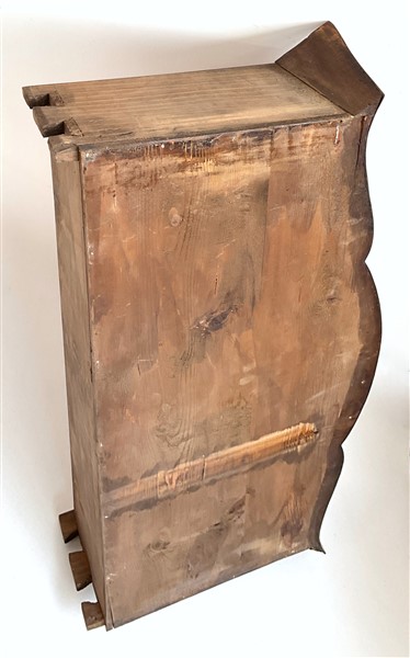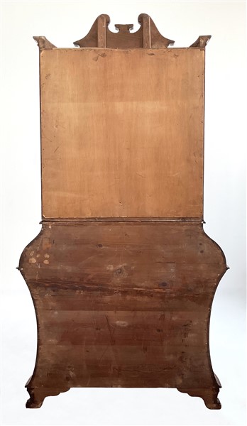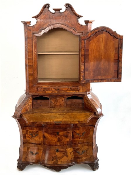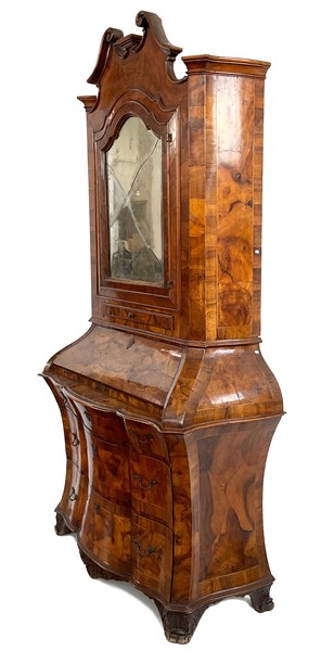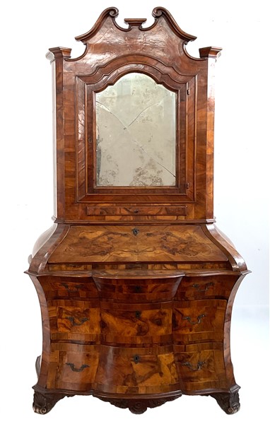 Trumeau lastronato in noce e radica di noce in stile settecentesco, parte inferiore bombata con fronte a tre diversi cassetti e calatoia celante quattro tiretti e un'antina, parte superiore ad un'anta specchiata e un tiretto, cimasa a volute contrapposte (cm 113x214x52) (difetti e rotture)
