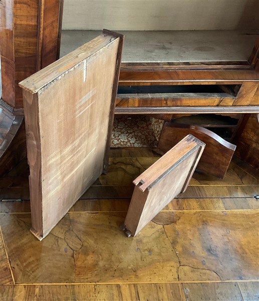 Trumeau lastronato in noce e radica di noce in stile settecentesco, parte infer