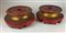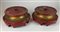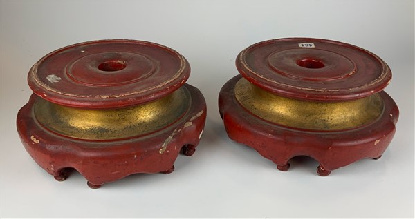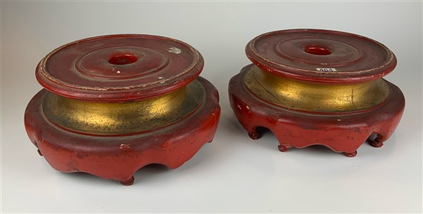 Coppia di basi orientaleggianti per grandi vasi in ceramica. Probabile esecuzione Fornaci San Lorenzo. Prima metà secolo XX. Legno intagliato e dipinto rosso. (h cm 15; d cm 32) (difetti)
