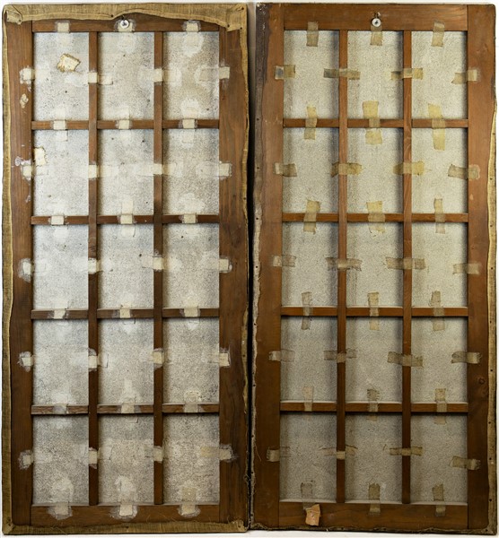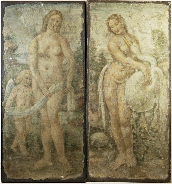 Ignoto, Leda e il cigno - Venere e Amore, coppia di tecniche miste su tela (cm 129,5x60 cad) (difetti)