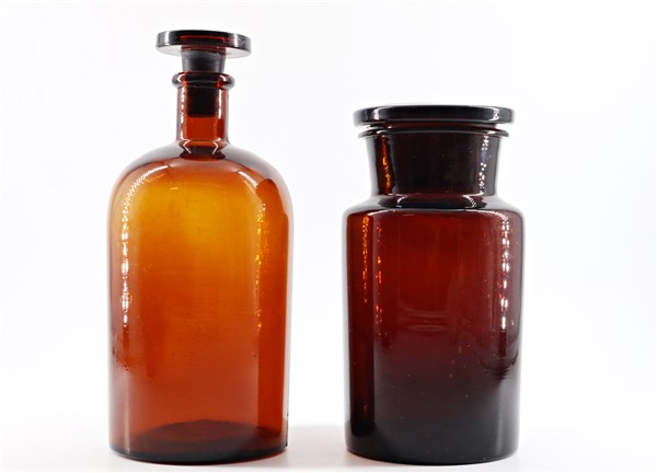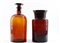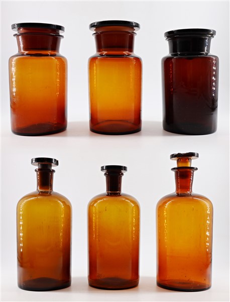 Cartone contenente numerosi flaconi e bottiglie da farmacia con tappo in vetro ambrato (difetti)