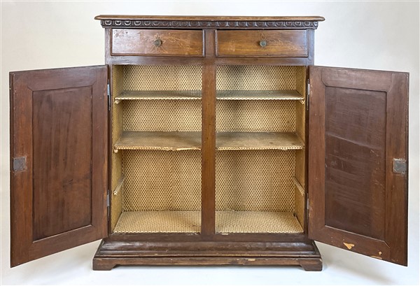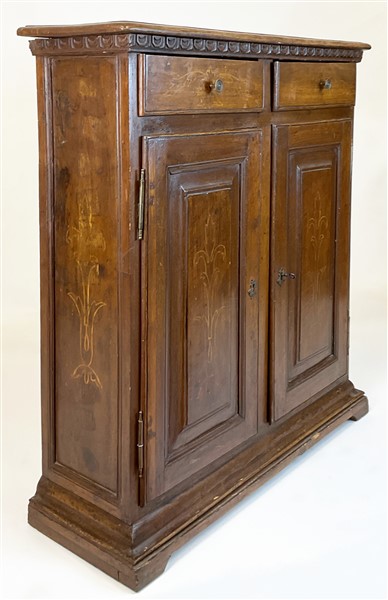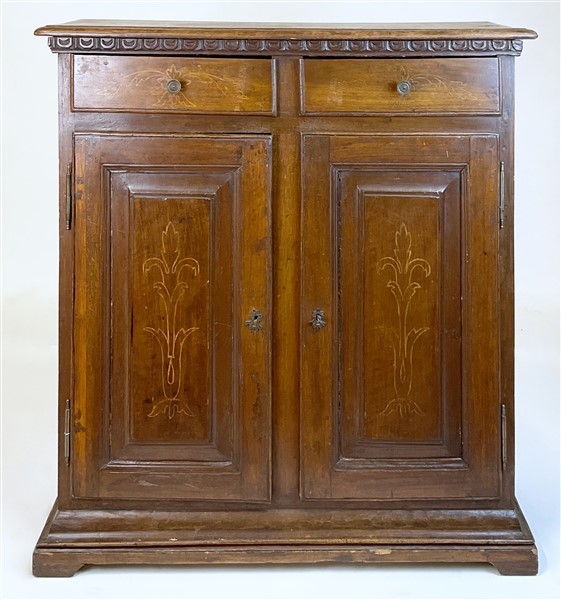 Credenza in noce a due ante pannellate e due cassetti sottopiano, bordo unghiat