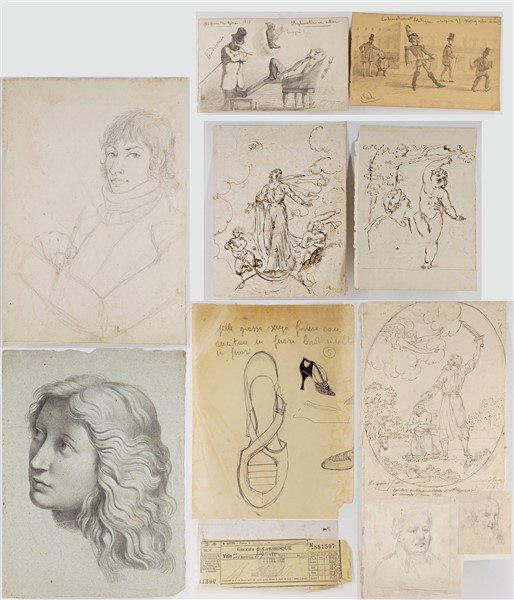Cartella contenente numerosi disegni di epoca, soggetto, tecnica e misure diffe