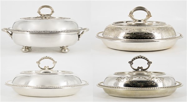 Lotto composto da quattro diverse legumiere in old Sheffield di forma ovale con