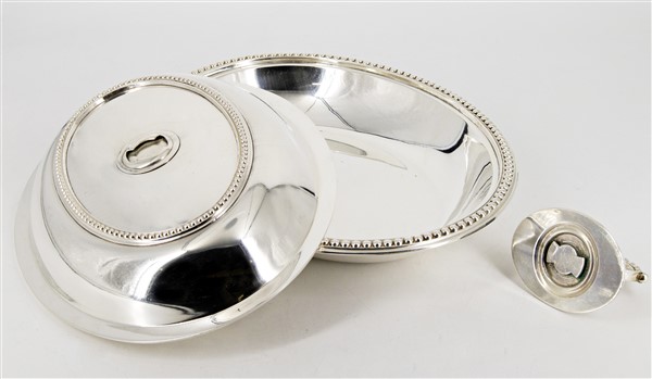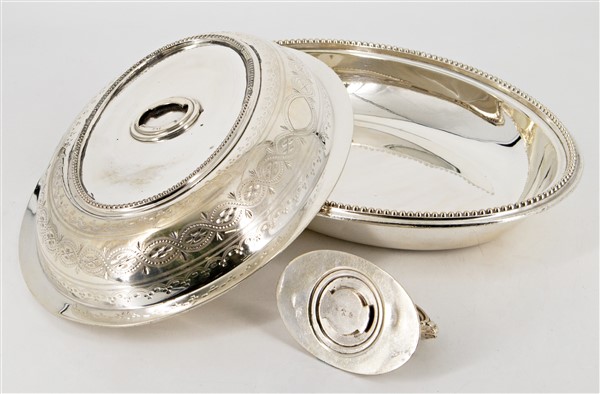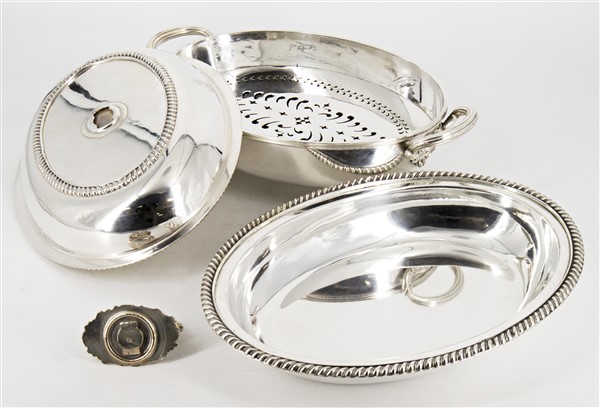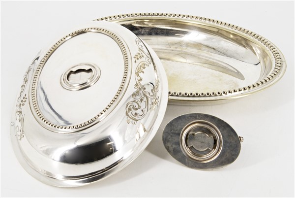 Lotto composto da quattro diverse legumiere in old Sheffield di forma ovale con coperchio e presa ad anello, una biansata con doppia vasca (cm max 33x15x22) (difetti)
