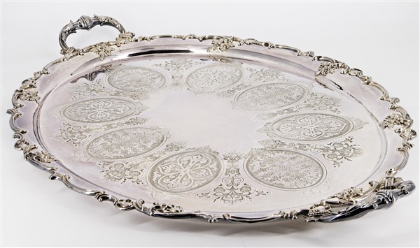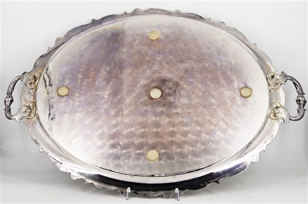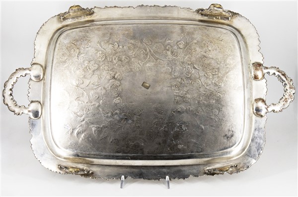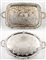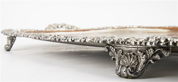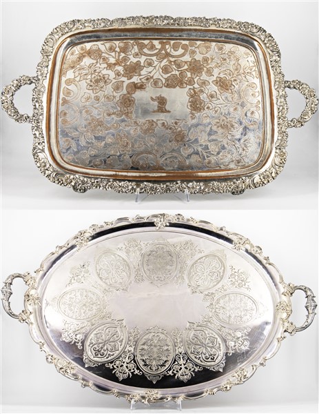 Lotto composto da due diversi vassoi biansati in old Sheffield di cui uno ovale e uno con piedini, decori a motivi floreali e stilizzati incisi (cm max 72x49) (difetti)