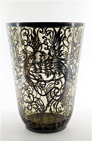 Vaso in vetro trasparente pagliesco con decori naturalistici applicati in foglia d'argento. Prima metà secolo XX. (h cm 25)
