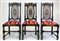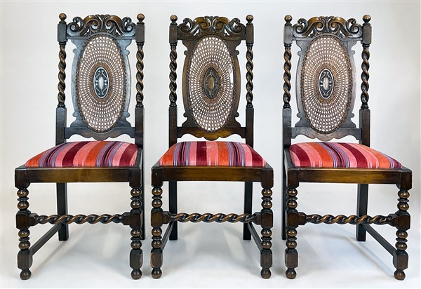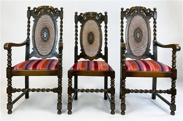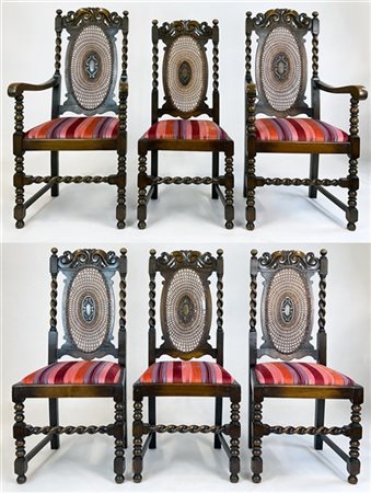 Gruppo di quattro sedie e due poltrone in rovere con schienale tra montanti a torchon centrati da cartella incannucciata sormontati da girali a volute, braccioli a ricciolo e gambe unite da traversa. Inghilterra, secolo XIX-XX (difetti)