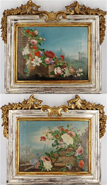 coppia di "Composizioni con fiori e rovine"