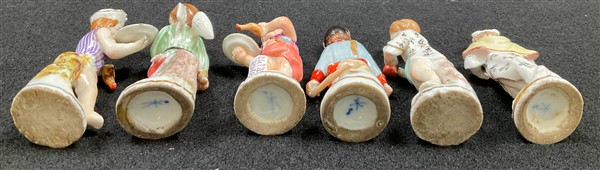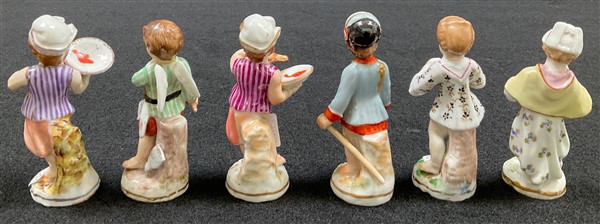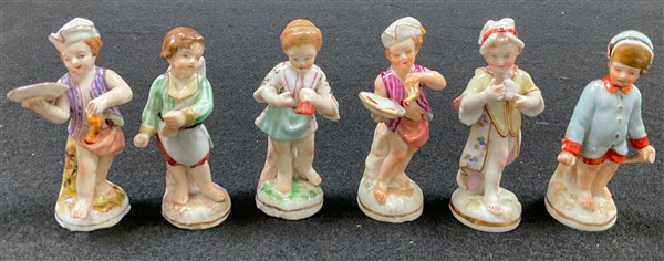 Manifattura del secolo XIX. Lotto composto da sei figure di fanciulli in porcellana dipinta in policromia e profilata in oro (h. max cm 8,5) (difetti)