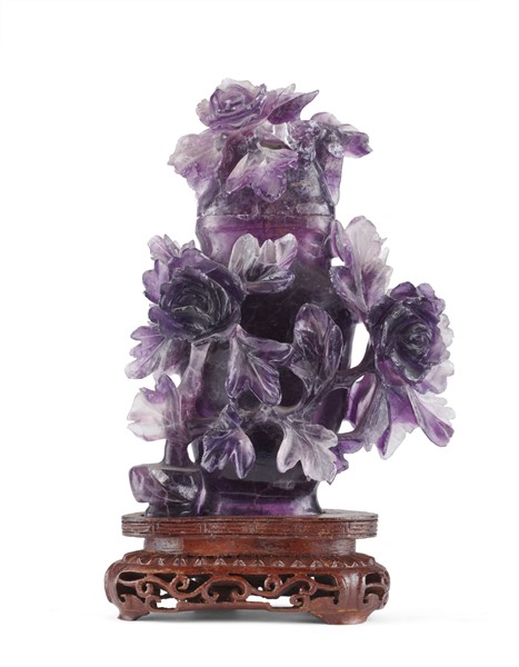 Vaso scolpito in ametista con decoro a fiori a rilievo poggiante su base in legno intagliato