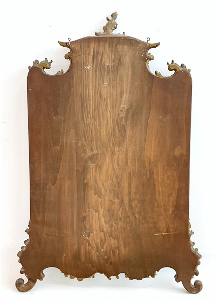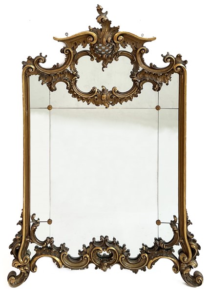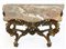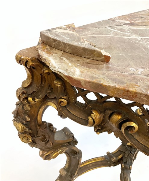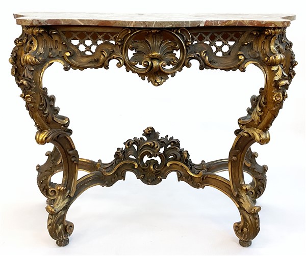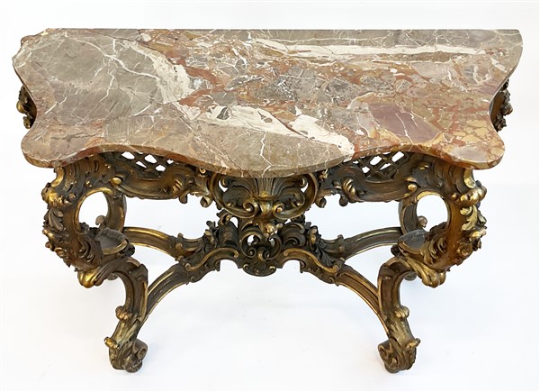 Console con specchiera in legno intagliato e dorato con gambe a volute contrapposte raccordate da crociera e fascia traforata centrata da valva di conchiglia, piano in marmo sagomato, specchiera con stesso decoro (cm totali 125x242x52) (difetti e rotture)