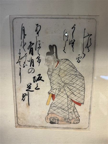 Katsukawa Shunsho, pagina da un libro xilografico raffigurante poeta e testo della sua poesia