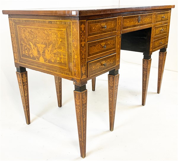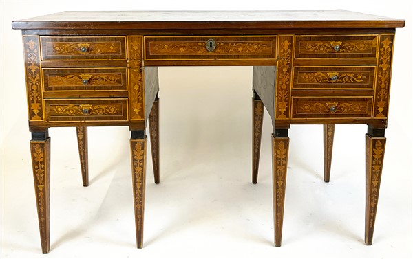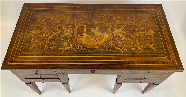 Scrivania da centro lastronata in palissandro, bois de rose e bois de violette, filettatta e intarsiata in legni vari, sul fronte a volute fogliate e candelabra, sui fianchi a fonte della vita, il piano a scena galante entro medaglione tra girali di foglie e fiori. Sette tiretti sul fronte, gambe ad obelisco rovesciato. (cm 121x79x61) (difetti)