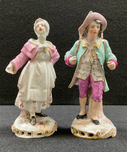 Manifattura del secolo XIX. Coppia di figure ispirate ai "Cris de Paris" in por