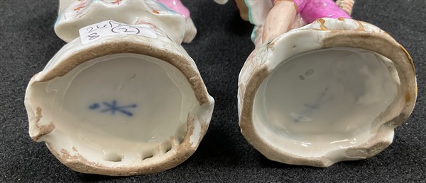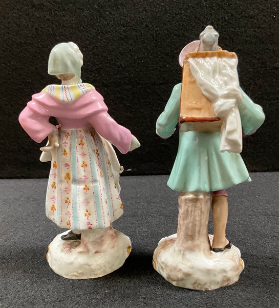 Manifattura del secolo XIX. Coppia di figure ispirate ai "Cris de Paris" in porcellana dipinta in policromia e profilata in oro (h. max cm 15) (difetti)