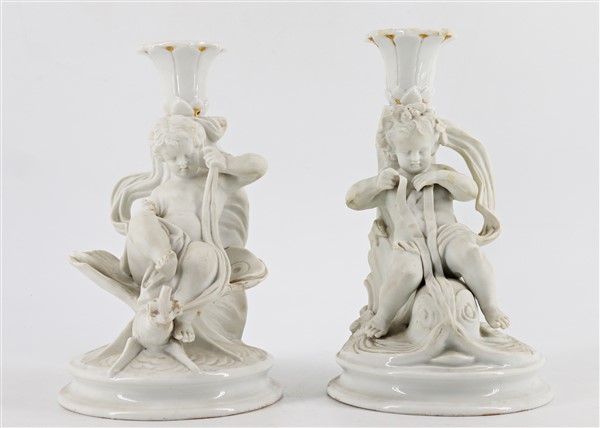 Manifattura del secolo XIX. Coppia di candelieri in biscuit e porcellana con sostegni a putti che cavalcano delfino e farfalla (h cm 19) (restauri e mancanze)