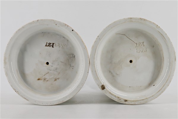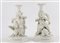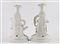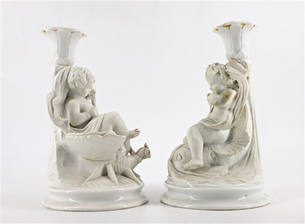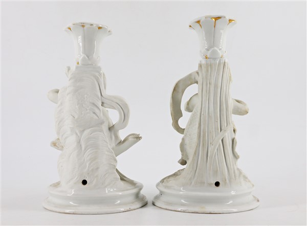 Manifattura del secolo XIX. Coppia di candelieri in biscuit e porcellana con so