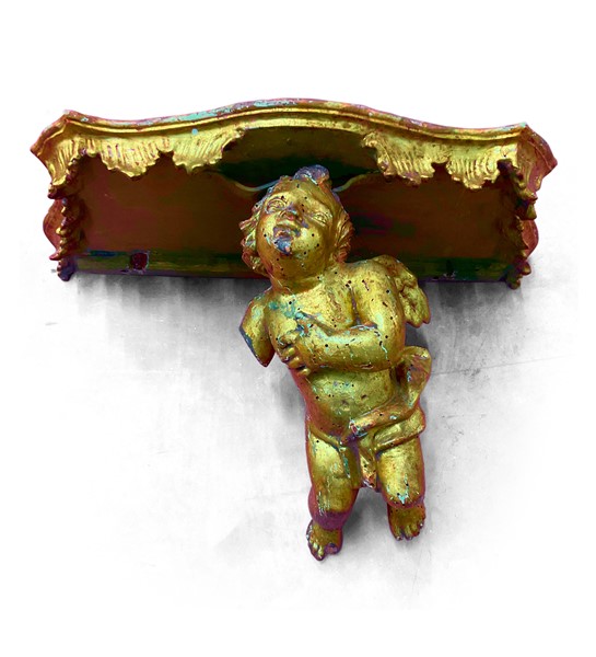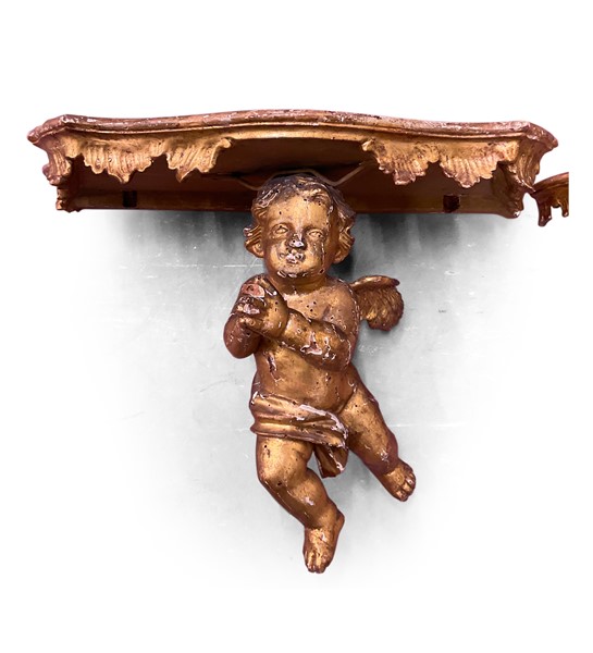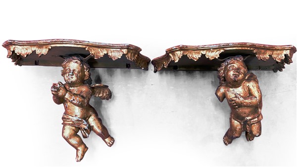 Coppia di mensole in legno intagliato e dorato, piano a finto marmo di forma sagomata, sostegni a putti alati e panneggiati. Secolo XIX (cm 48x38x23,5) (difetti, restauri e mancanze)
